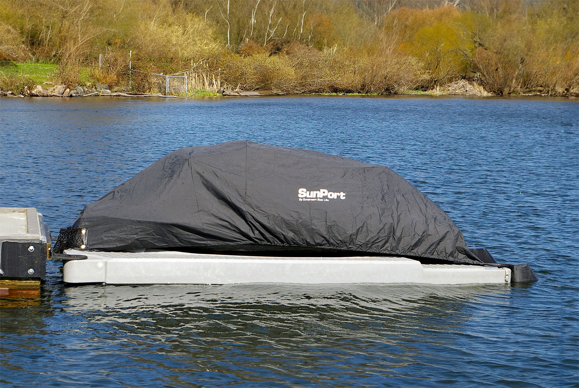 Molded and foam-filled polyethylene construction makes the SunPort2™ drive-on dock unsinkable and virtually indestructible. Add on a QuickCover™ to complete the ultimate PWC storage system. The front of the cover is attached to the bow stop, and the rear of the cover simply clips on to the rear corners of the SunPort2. Use the net on the bow stop stores the cover when not in use.